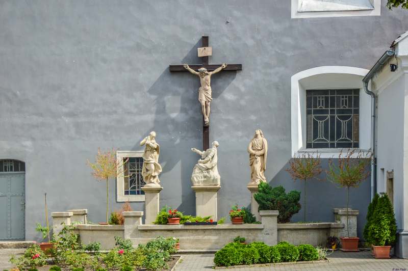 Kalváriu pri františkánskom kostole v podobe troch drevených krížov s korpusmi ukrižovaných v drevenej ohrádke vybudovali veriaci so zemepánom roku 1717. Roku 1735 za nimi na fasáde kostola pribudla maľba jeruzalemskej Golgoty, ktorú roku 1775 premaľovali. Na Kalváriu pridali sochy plačúcej Panny Márie a sv. Jána Evanjelistu na podstavcoch a neskôr aj sochu sv. Magdalény. Pôvodné sochy časom schátrali. Začiatkom 90. rokov boli sochy už zložené, kríže lotrov už neexistovali a pod navŕšenou zeminou sa našli staré podstavce pod sochami. Roku 1996 zhotovil ich kópie z umelého kameňa vrátane novej sochy Krista a vrátane podstavcov reštaurátor Ján Patka. Zrekonštruovanú Kalváriu v máji toho roku posvätil pomocný biskup Vladimír Filo. Kalváriu obnovili s novými sochami na nových podstavcoch, bez navŕšenej zeminy, neobnovili sa ani kríže lotrov, ani maľba Golgoty na fasáde. Pôvodné torzá sôch sú umiestnené v lapidáriu v krypte pod kláštorným kostolom. Zdroj: http://www.kriz.epocha.sk/index.php/krize-na-zahori/okres-malacky/495-malacky-kalvaria-1717 Foto: Ján Fiala