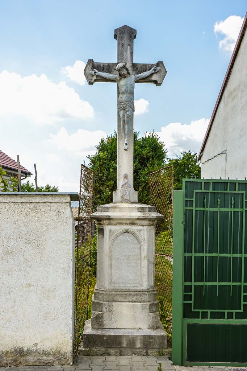 Na Pezinskej ceste trochu skrytý v rade domovej zástavby sa nachádza kamenný kríž. Štefan Vísmek dal postaviť tri kríže a dnes je len na tomto zachovalá pôvodná krížová nadstavba. V kartuši podstavca je vyrytý rovnaký text, ako bol aj na ďalších dvoch jeho krížoch v Gajaroch. Kríž tento / na čest a chválu / Božú a k pozbudzeňú / K vďačnosti za nás / ukrižovaňému pomimo idúcych: / už podruhé Z púti / Jerulazemskej, a z / Rimu šťastlive sa / navrátiac, na vlastné / útraty postavit dal 1892 / Štefan Vismek / rodiak Gajarsky. Vísmek dal teda tieto kríže postaviť po svojom presťahovaní do Malaciek. Hallon (Pavol Hallon: Z dejín malackej farnosti, Malacky 1993, str. 81.) uvádza pri malackom kríži upresnený dátum 13. 9. 1892. Najskôr ide o vysviacku kríža. Zdroj: http://www.kriz.epocha.sk/index.php/krize-na-zahori/okres-malacky/502-malacky-kriz-1892-v-meste Foto © Peter Blažíček