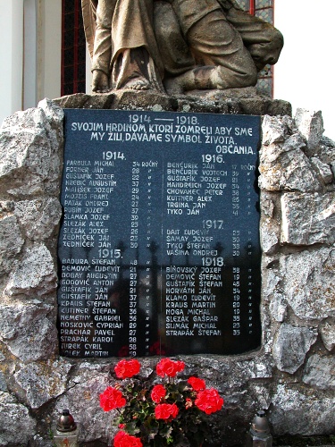 Nachádza sa na Farskej ulici, za plotom farského kostola Nanebovzatia Panny Márie Nápis: 1914 – 1918 SVOJIM HRDINOM, KTORÍ ZOMRELI ABY SME MY ŽILI, DÁVAME SYMBOL ŽIVOTA. OBČANIA. 1914 FARBULA MICHAL 34 ROČNÝ, FORNER JÁN 28 ROČNÝ, GUŠTAFÍK JOZEF 22 ROČNÝ, HREBIČ AUGUSTÍN 37 ROČNÝ, MALÍŠEK JOZEF 29 ROČNÝ, MOJŽIŠ FRANT. 24 ROČNÝ, PATÁK ONDREJ 27 ROČNÝ, RUBÍN JOZEF 37 ROČNÝ, SLÁMKA JOZEF 39 ROČNÝ, SLEZÁK ALEX. 23 ROČNÝ, SLEZÁK JOZEF 26 ROČNÝ, ZEDNÍČEK JÁN 23 ROČNÝ, ZEDNÍČEK JÁN 30 ROČNÝ 1915 BAĎURA ŠTEFAN 48 ROČNÝ, DEMOVIČ ĽUDEVÍT 21 ROČNÝ, DOBAY AUGUSTÍN 27 ROČNÝ, GODOVIČ ANTON 27 ROČNÝ, GUŠTAFÍK JÁN 21 ROČNÝ, GUŠTAFÍK JÁN 37 ROČNÝ, KRAUS ŠTEFAN 37 ROČNÝ, KUTTNER ŠTEFAN 36 ROČNÝ, NÉMETHY GABRIEL 36 ROČNÝ, NOSKOVIČ CYPRIÁN 29 ROČNÝ, PRACHÁR PAVEL 27 ROČNÝ, STRAPÁK KAROL 28 ROČNÝ, TUREK CYRIL 58 ROČNÝ, VOLEK MARTIN 59 ROČNÝ 1916 BENČURÍK JÁN 17 ROČNÝ, BENČURÍK VOJTECH 39 ROČNÝ, GUŠTAFÍK JOZEF 21 ROČNÝ, HANDREICH JOZEF 34 ROČNÝ, CHOVANEC PETER 38 ROČNÝ, KUTTNER ALEX. 26 ROČNÝ, TRGINA JÁN 35 ROČNÝ, TYKO JÁN 41 ROČNÝ 1917 DAIT ĽUDEVÍT 23 ROČNÝ, ŠAMAY JOZEF 30 ROČNÝ, TYKO ŠTEFAN 38 ROČNÝ, VAŠINA ONDREJ 30 ROČNÝ 1918 BÍŇOVSKÝ JOZEF 38 ROČNÝ, DEMOVIČ ŠTEFAN 19 ROČNÝ, GUŠTAFÍK ŠTEFAN 45 ROČNÝ, HORVÁTH JÁN 34 ROČNÝ, KLAMO ĽUDEVÍT 19 ROČNÝ, KRAUS MARTIN 20 ROČNÝ, NOGA MICHAL 19 ROČNÝ, SLEZÁK GAŠPAR 35 ROČNÝ, SLIMÁK MICHAL 23 ROČNÝ, STRAPÁK ŠTEFAN 35 ROČNÝ Zdroj: http://www.vets.cz/vpm/mista/obec/4405-pezinok/