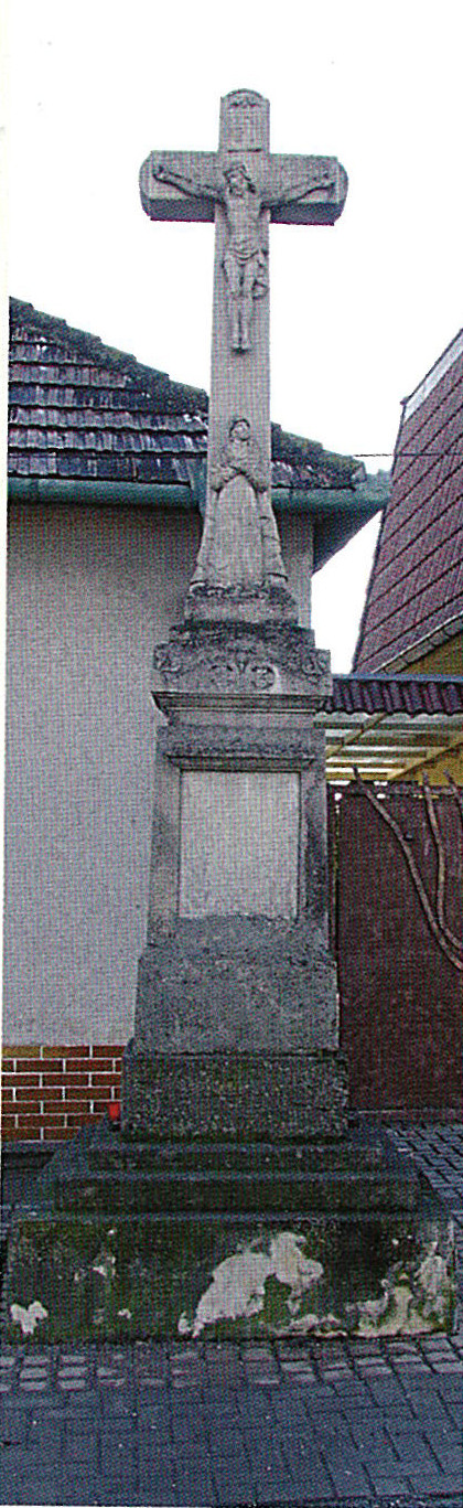 Kríž má obdĺžnikový podstavec s vrchnou časťou, zdobenou vegetatívnym ornamentom a s nápisovou plochou na prednej strednej strane, ktorej text je v súčasnosti nečitateľný. Súčasťou kríža sú kamenné skulptúry ukrižovaného Ježiša Krista a Panny Márie. Zdroj foto: z knihy Pamiatky a pamätihodnosti Ivanky pri Dunaji.