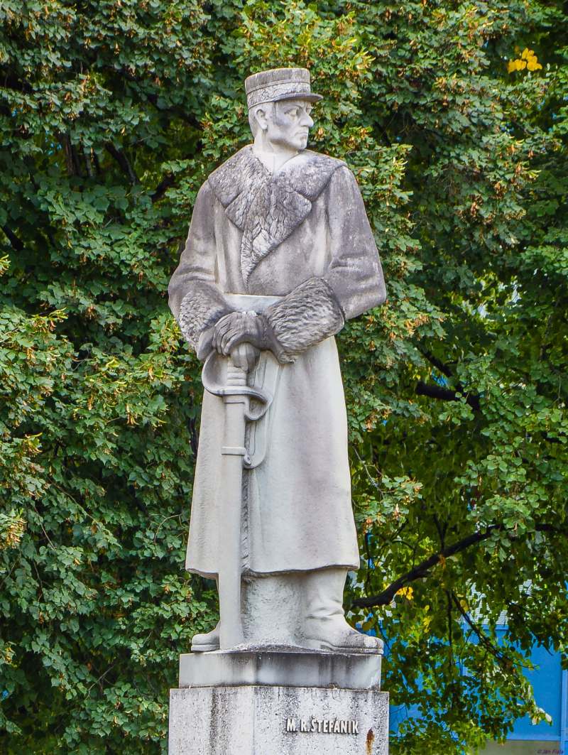 Socha, ktorá je dielom Vojtecha Ihriského, mala zaujímavý osud. V roku 1944 ju odhalili pri príležitosti 25. výročia smrti Štefánika. Začiatkom 50. rokov 20. storočia ju komunisti strhli a spodnú časť zakopali. Táto sa našla pri kopaní základov budovy podnikateľského inkubátora. Vrchnú časť, ktorá sa nenašla, vytvoril akademický sochár Juraj Gavula. Socha bola druhý raz odhalená 30. apríla 2006. Nachádza sa na Mierovom námestí, pri Čiernom kláštore. Zdroj: http://malackepohlady.sk/?page_id=8575